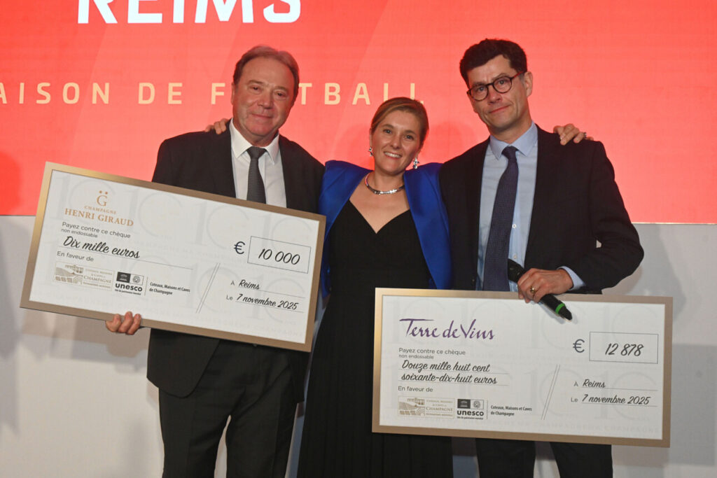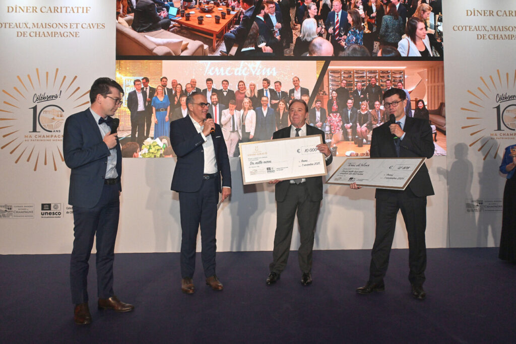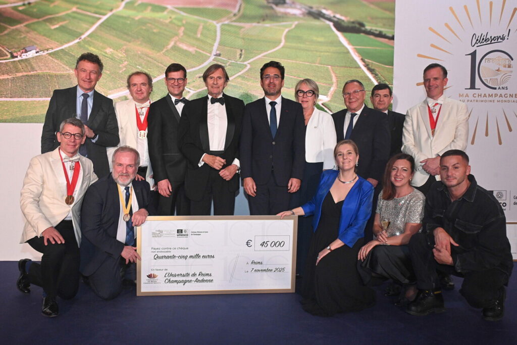 À l’occasion des dix ans du classement de la Champagne au Patrimoine mondial, la Mission UNESCO organisait vendredi dernier au Palais des Congrès un dîner de gala, avec comme invité d’honneur Daniel Rondeau, champenois et membre de l’Académie française, désigné comme parrain de la soirée. Bilan de ce bel événement : la collecte de 45.000 euros versés à l’Université de Reims pour le financement du projet Cellars et la remise d’un chèque de 12.878 euros, résultat de la vente aux enchères des cuvées vainqueurs du Best Old Vintage Awards. Terre de vins a pu annoncer le lancement d’une nouvelle édition de ce concours en 2026 sur les millésimes 1995, 1996 et 1998.